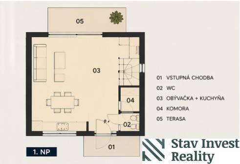 Prízemie tvorí vstupná chodba, WC, komora a priestranná obývacia izba prepojená s kuchyňou a výstupom na terasu.
